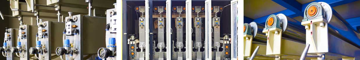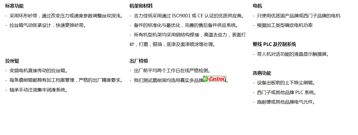 該系列設(shè)備有干拋或油拋兩種加工方式。經(jīng)過轉(zhuǎn)速極低的砂輥,通過調(diào)整砂輥向下的壓力,使套在砂輥外部的環(huán)形砂帶在金屬表面拉出直紋。經(jīng)過機組加工的直絲HL(Hair-Line)金屬板材,表面紋理清晰,縱向2米長度內(nèi)直紋紋理的偏斜不超過2mm。